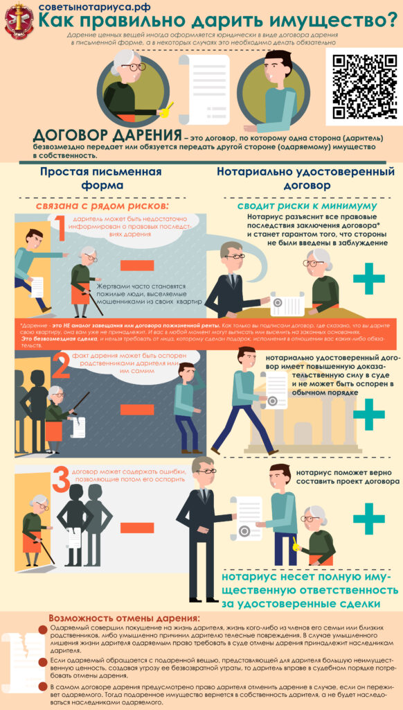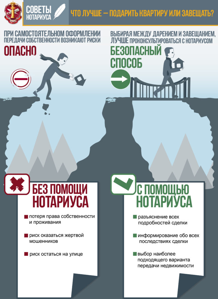 Собираясь заключить договор дарения, лучше несколько раз подумать. А еще обратиться за консультацией к нотариусу. Нотариус обязательно разъяснит все подробности сделки, расскажет о том, какие последствия могут наступить после ее заключения. В случае если после этого уверенность в необходимости заключения договора дарения исчезнет, нотариус поможет выбрать другие варианты передачи недвижимости. Ими могут быть и завещание, и сделка купли-продажи и т.п. Главное, не пренебрегать возможностью получить профессиональный совет. Ведь нотариус, это, прежде всего, высококвалифицированный юрист широкого профиля, который работает в интересах граждан.